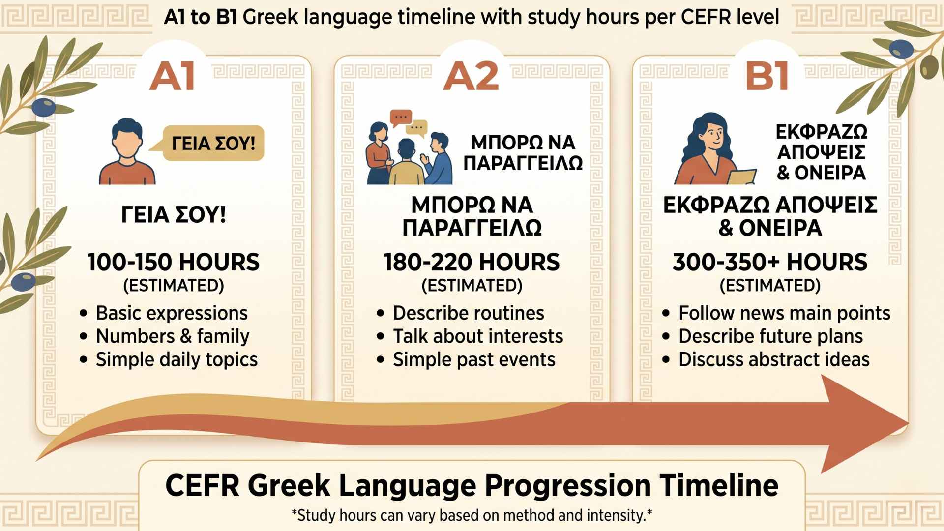 - If you're already in Greece, your passive exposure accelerates listening and pragmatic skills substantially. You'll reach comprehension milestones faster than the raw hour count suggests.