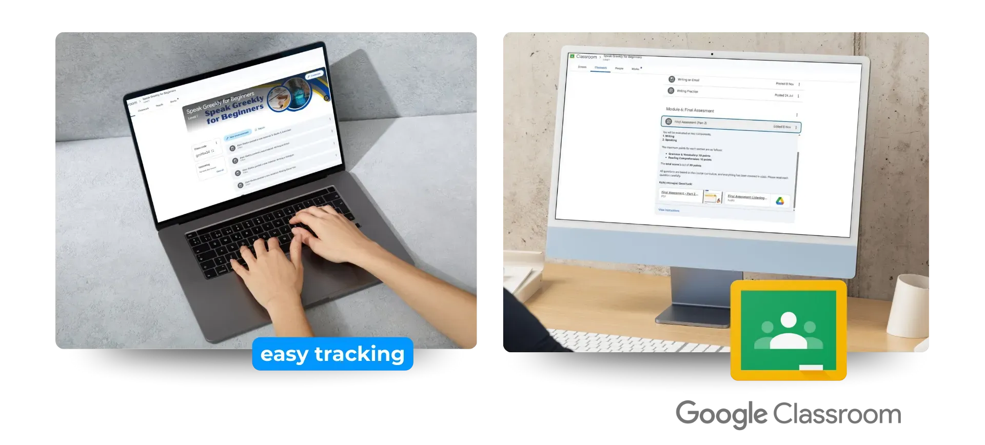 Track your progress with ease through our platform and Google Classroom. All your assignments, results, and feedback are organized in one place, so you always know exactly where you stand and what to do next.