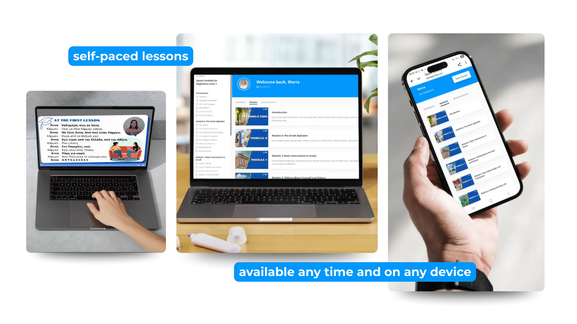 Learn at your own pace with structured video lessons you can access anytime, from any device. Whether you're on your laptop or on the go, the platform adapts to your schedule so you can keep progressing consistently.
