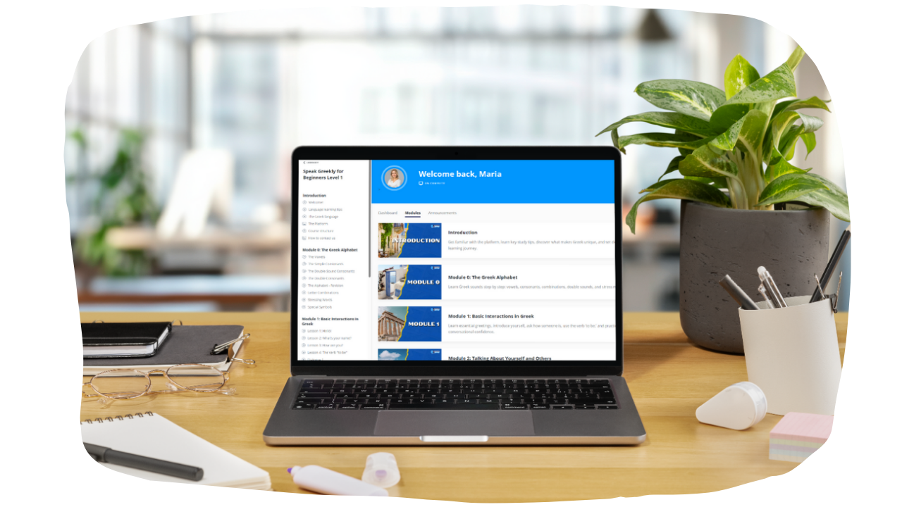 In this short walkthrough, you’ll explore the Speak Greekly platform and how our hybrid method brings together structured self-paced learning with guided live classes, all in one clear, easy-to-use space.
